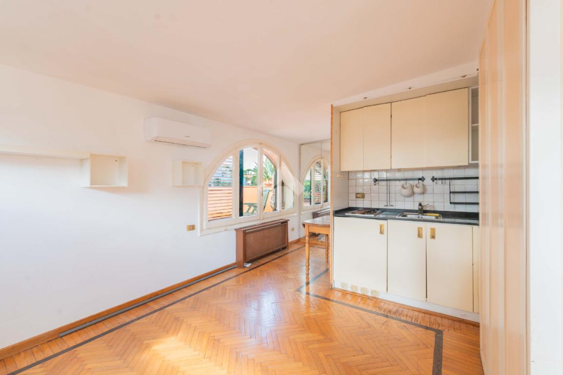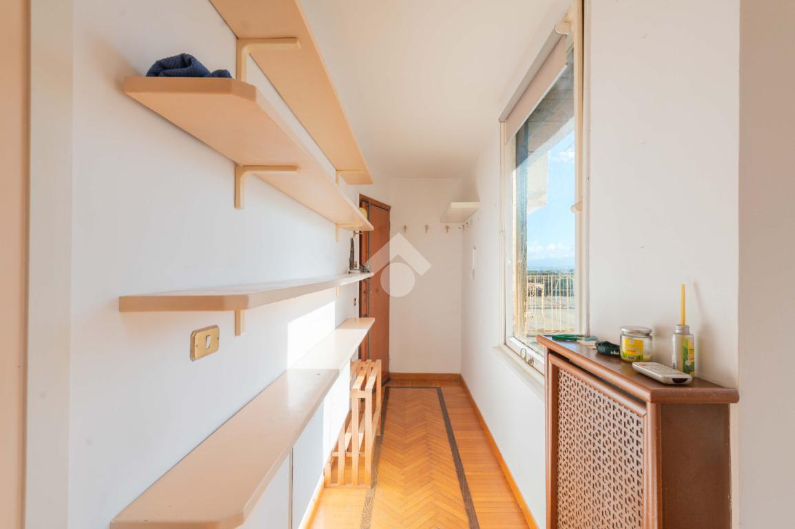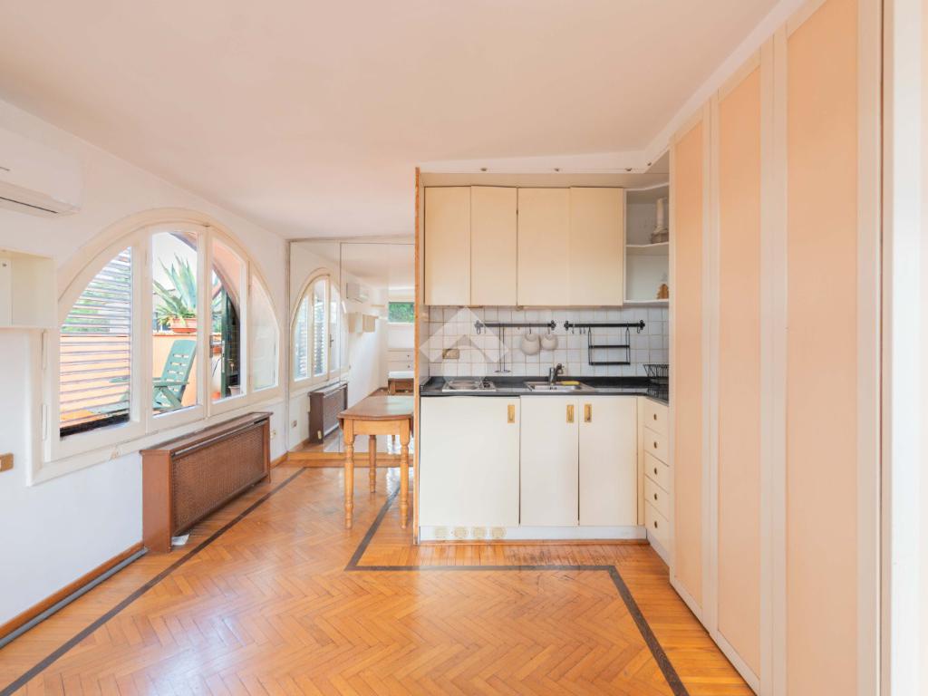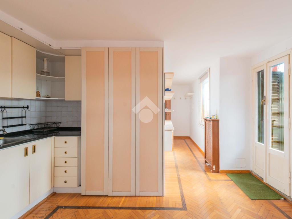 SUPERATTICO di circa 35 mq posto al 5° piano all'interno di una palazzina dotata di ascensore che arriva al 4° all' interno di un comprensorio di due palazzine in cortina. L'immobile è composto da ingresso, zona giorno/notte, angolo cottura, due armadi a muro e bagno finestrato con doccia. Il vero protagonista è l'ampio terrazzo di circa 100 con affaccio aperto e panoramico nel verde. Dispone di pavimenti in parquet, climatizzatore ed il riscaldamento centralizzato con i contabilizzatori. La soluzione immobiliare è da ristrutturare.
