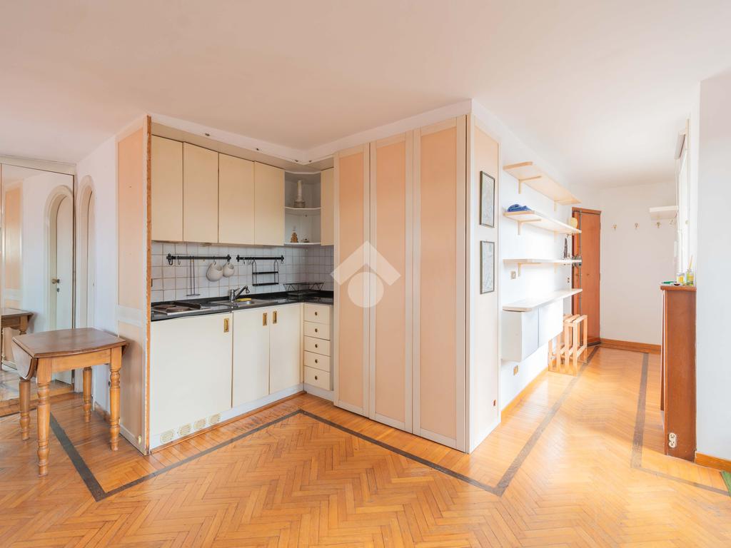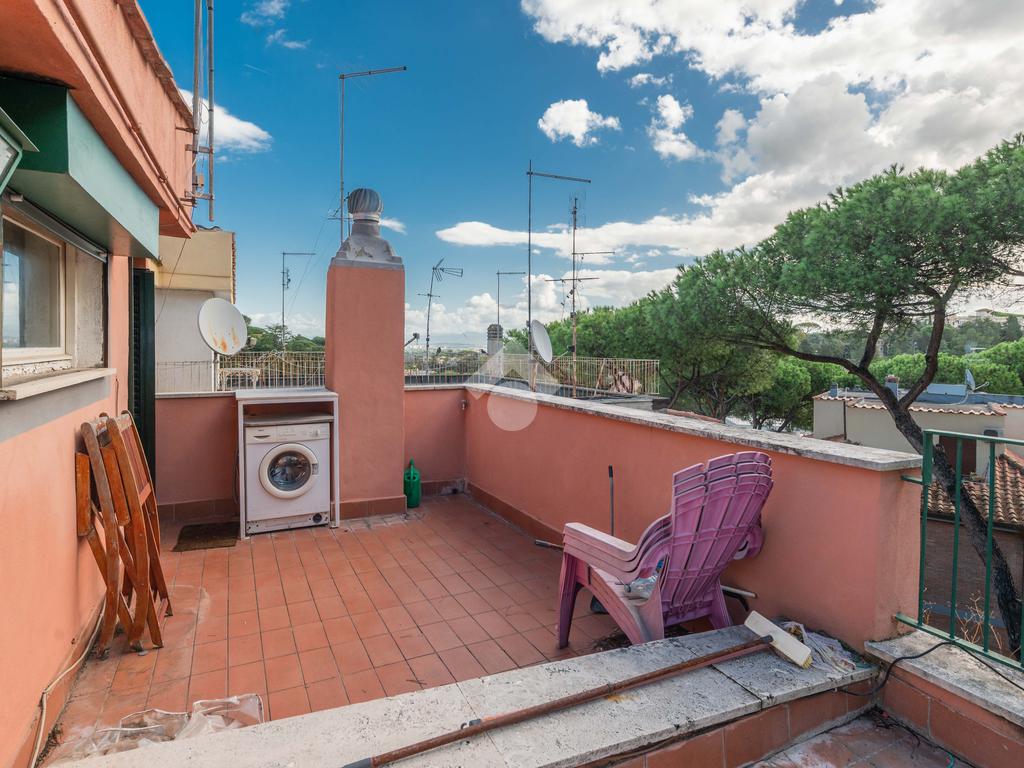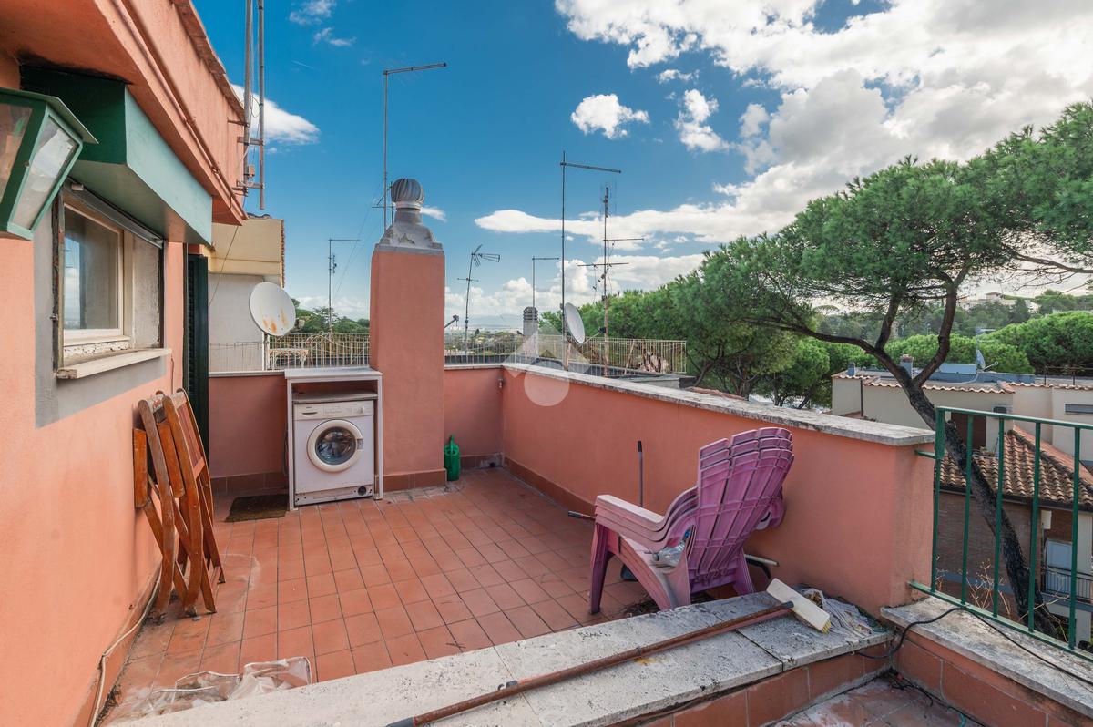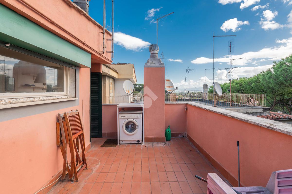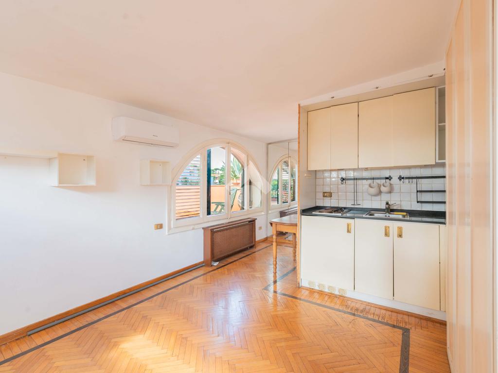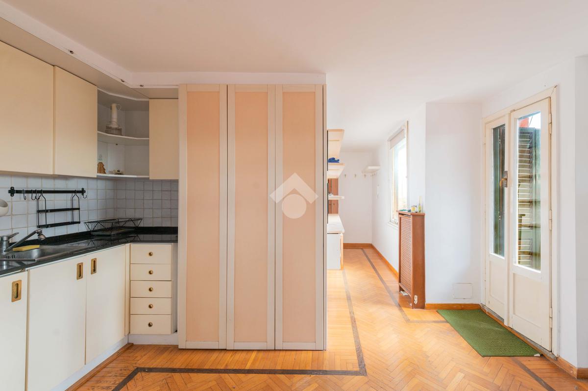SUPERATTICO di circa 35 mq posto al 5° piano all'interno di una palazzina dotata di ascensore che arriva al 4° all' interno di un comprensorio di due palazzine in cortina. L'immobile è composto da ingresso, zona giorno/notte, angolo cottura, due armadi a muro e bagno finestrato con doccia. Il vero protagonista è l'ampio terrazzo di circa 100 con affaccio aperto e panoramico nel verde. Dispone di pavimenti in parquet, climatizzatore ed il riscaldamento centralizzato con i contabilizzatori. La soluzione immobiliare è da ristrutturare.